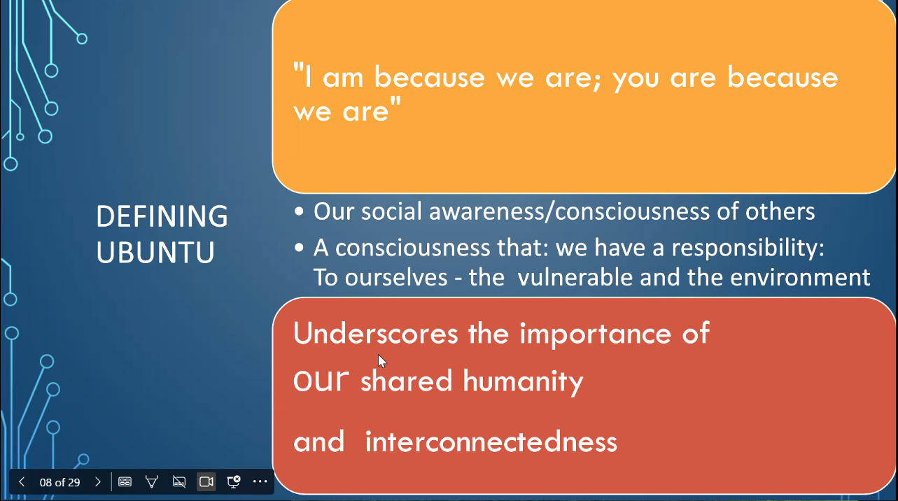 Dr. Idumwonyi told us that Ubuntu is a South African concept introduced to the rest of the world through Reverend Desmond Tutu during the time of reconciliation in South Africa at the end of Apartheid. She asked us to reflect on these statements.