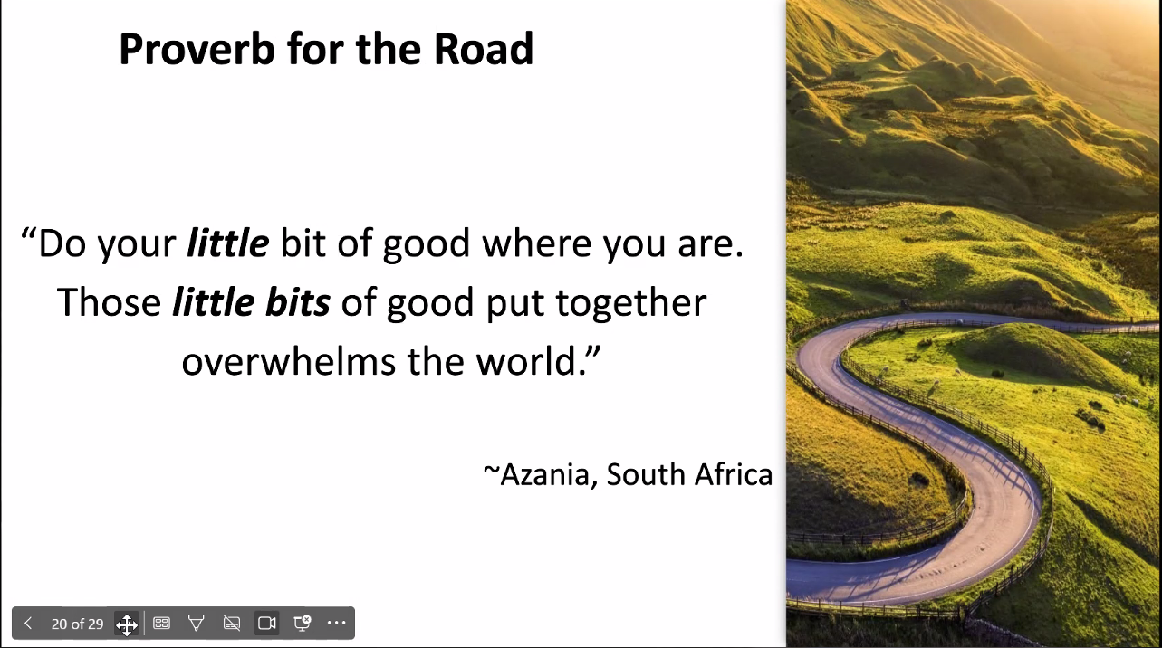 Dr. Idumwonyi began her presentation on “Ubuntu: How an Ancient African Concept Can Help Humans Flourish” by showing a bundle of colorful ribbons being braided together. She asked us to think about how that related to the human community. Responses included: